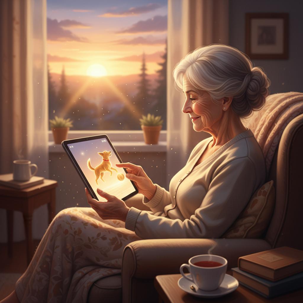 Starsza kobieta z wirtualnym psem na tablecie — obraz, który staje się coraz popularniejszy w polskich domach.
